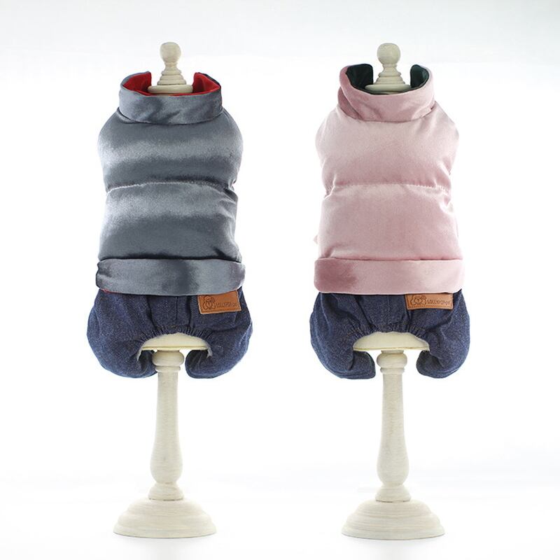 ダウンジャケット風のトップスにデニムパンツの小型犬服